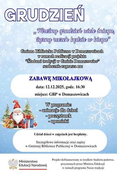 W grudniu zapraszamy wszystkie dzieci do udziału w wyjątkowym wydarzeniu przygotowanym przez Gminną Bibliotekę w Domaszowicach.