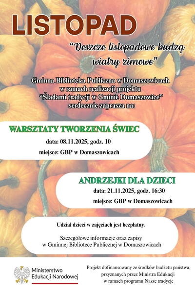 W listopadzie zapraszamy wszystkie dzieci do udziału w wyjątkowych wydarzeniach przygotowanych przez Gminną Bibliotekę Publiczną w Domaszowicach.