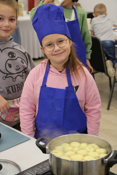 Podczas zajęć dzieci miały okazję nauczyć się przygotowywać tradycyjną potrawę regionu – kluski z roladą i modrą kapustą.