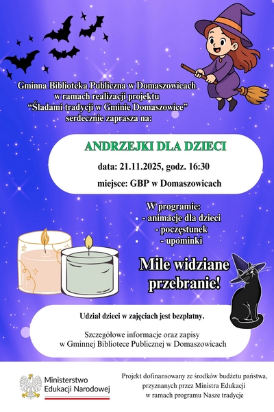 Serdecznie zapraszamy wszystkie dzieci na magiczne Andrzejki, które odbędą się 21 listopada 2025 r. (piątek) o godz. 16:30 w Bibliotece, Centrum Kultury w Domaszowicach