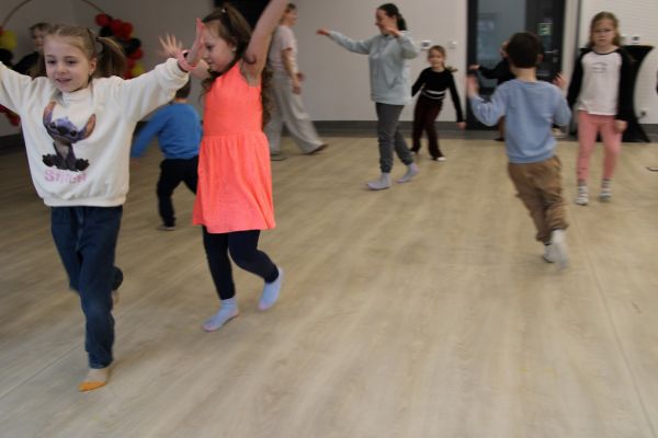 Po części plastycznej przyszedł czas na zabawy ruchowe, które dostarczyły mnóstwo śmiechu, energii i dobrej zabawy. Był to doskonały sposób na aktywne rozpoczęcie ferii zimowych.