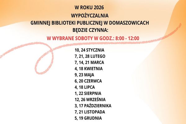 Przedstawiamy harmonogram pracujących sobót w 2026 roku w Gminnej Bibliotece Publicznej w Domaszowicach.