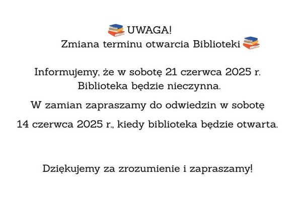 - 2 maja 2025 roku (piątek) oraz 10 listopada 2025 roku (poniedziałek) ustala się dniami wolnymi od pracy dla pracowników Gminnej Biblioteki Publicznej w Domaszowicach, w zamian za dzień 3 maja 2025 r. oraz dzień 1 listopada 2025 r. święta, przypadające w dzień wolny od pracy (sobota).