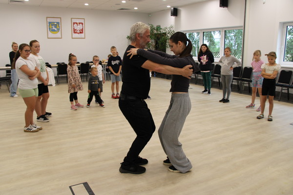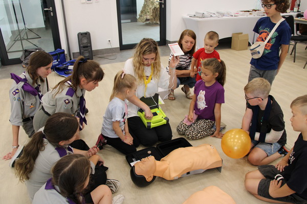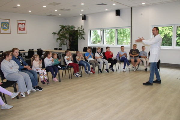 Na kolejnych zajęciach wakacyjnych z profilaktyką odbyło się spotaknie z ratownikiem medycznym - Andrzej Wojnarowski, który przeprowadził warsztaty dla dzieci z zakresu udzielania pierwszej pomocy przedmedycznej. Na spotkaniu ratownik udzielał instruktażu postępowania podczas udzielania pierwszej pomocy w nagłych wypadkach, do momentu pojawienia się służb medycznych. Uświadomił wszystkich, że tzw. ”złote minuty” ratują życie poszkodowanego. Przypomniał również ważne telefony alarmowe. Pan Andrzej zademonstrował, jak ułożyć rannego w pozycji bocznej ustalonej jako pozycji bezpiecznej dla osoby poszkodowanej. Dużym zainteresowaniem uczestników cieszyły się wskazówki związane z masażem serca i sztucznym oddychaniem. Gość wyjaśnił, dlaczego te czynności są tak ważne w pierwszych minutach. Po omówieniu zasad zarówno dzieci, jak i dorośli bardzo chętnie brali udział w wykonywaniu podstawowych czynności ratowniczych pod fachowym okiem Pana Andrzeja Wojnarowskiego. Ponad to ogromne zainteresowanie wzbudził ambulans. Każdy miał możliwość zobaczenia, jak wygląda w środku i jak jest wyposażona “sanitarka”.