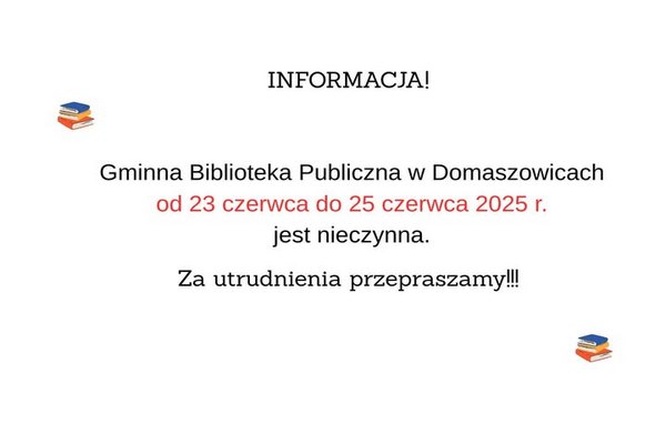 Zgodnie z Zarządzeniem nr GBP.100.2.2025 Dyrektora Gminnej Biblioteki Publicznej w Domaszowicach z dnia 8 kwietnia 2025 r.