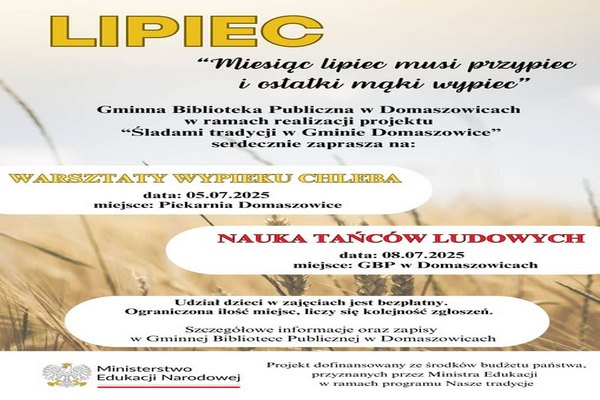 Zapraszamy na sierpniowe wydarzenia w ramach projektu "Śladami tradycji w Gminie Domaszowice"!