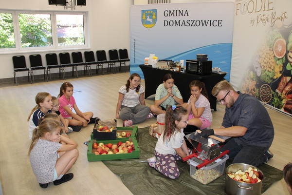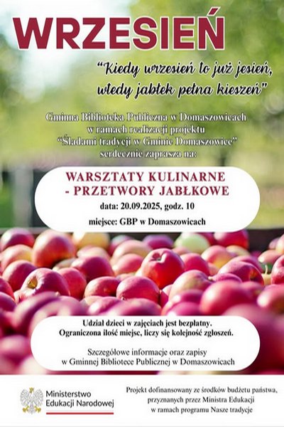 W dniu 20 września 2025 r. w Gminnej Bibliotece Publicznej w Domaszowicach odbyły się warsztaty kulinarne, które poprowadził doświadczony kucharz. Uczestnicy mieli okazję poznać różne odmiany jabłek oraz ich walory zdrowotne, smakowe i użytkowe. Dowiedzieli się także, jak dawniej przechowywano i przetwarzano owoce, by móc cieszyć się ich smakiem przez całą zimę.