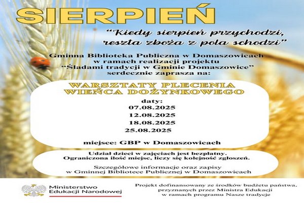 Wspólnie poznamy znaczenie zbóż i symbolikę kłosów, wstążek, kwiatów, a także stworzymy koronę dożynkową, która już we wrześniu zostanie zaprezentowana podczas gminnych dożynek!