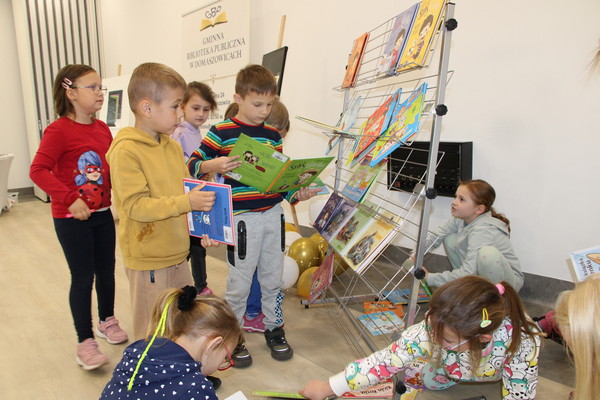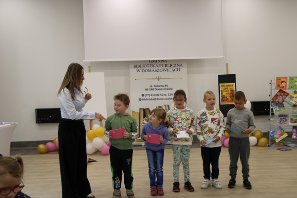 W dniu 21 kwietnia 2023 r. dzieci ze Szkoły Podstawowej im. Stefana Żeromskiego w Domaszowicach wzięły udział w zajęciach zorganizowanych przez Gminną Bibliotekę Publiczną w Domaszowicach. Głównym celem zajęć było zachęcenie najmłodszych czytelników do korzystania z biblioteki, wypożyczania książek oraz nieustannego rozwijania umiejętności czytania. Uczestnicy zajęć dowiedzieli się, jak należy dbać o książki i jak z nich korzystać. Odgadywały także bajkowe zagadki, które sprawdziły ich znajomość bohaterów baśni i bajek. Dzieci z dużym zaangażowaniem uczestniczyły w zorganizowanych dla nich zajęciach oraz przekonały się jak wiele radości i niespodzianek mogą dostarczyć książki. Przy tej okazji odbyło się pasowanie uczniów klasy I ze Szkoły Podstawowej w Domaszowicach na czytelników biblioteki. Po uroczystym pasowaniu nowi czytelnicy otrzymali pamiątkowy dyplom, zakładkę do książki i słodki upominek.