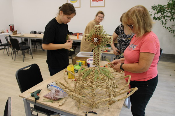 To już ostatnie spotkanie, na którym pod okiem naszej twórczyni Marioli Karmańskiej dokańczaliśmy wieniec, dodawaliśmy ozdoby i spinając ostatnie kłosy, domykaliśmy dzieło.